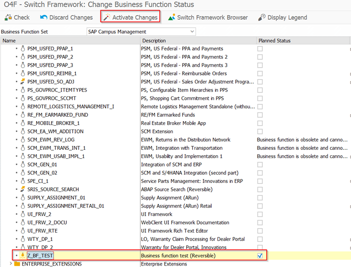 Por último, tendremos que acceder a la transacción SFW5, donde deberemos la Business Function que hemos creado y simplemente activarla: